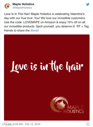 案例:在线天然护肤品牌 Maple Holistics 就曾推出一系列专门用于社交媒体的优惠。在以下案例中,他们给 Twitter 粉丝提供在 Amazon 上购买享八五折的优惠。
