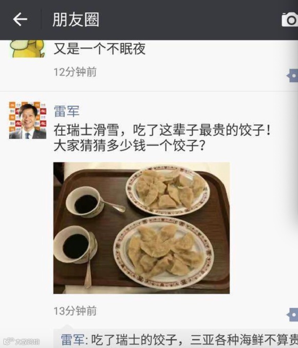 自从接触这一“白色鸦片”,雷军对滑雪的热爱就一发不可收拾。他的足迹遍及国内外雪场,2017年除夕在瑞士滑雪,不惜吃单价68元一个的饺子。有意思的是,即使在雪场上,雷军也不忘推销自家TS滑雪镜、对讲机等产品。或许这就是企业家的自我修养。