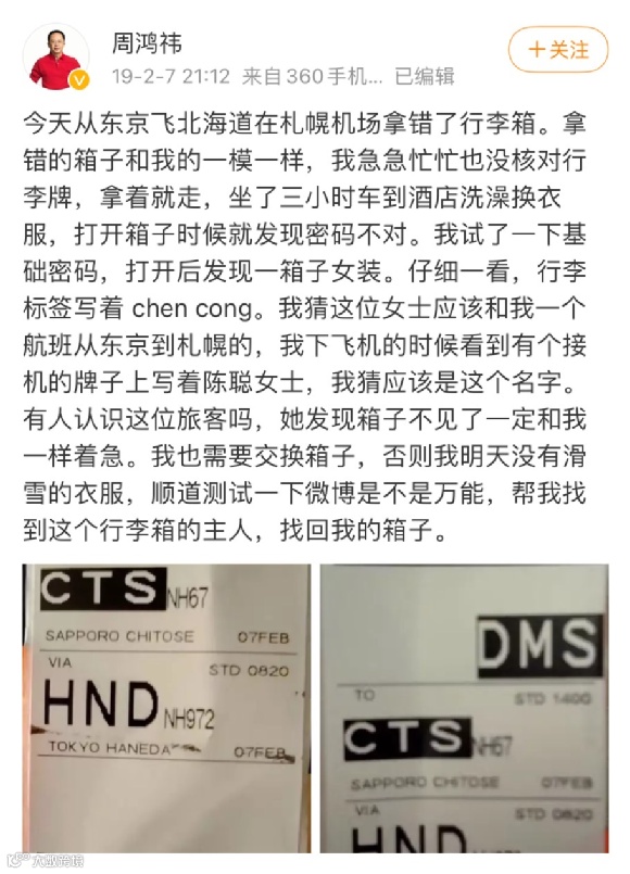 同为互联网企业的双板代表,周鸿祎给人留下最深印象的却不是雪场上的英姿,而是日本机场拿错行李箱的事件。2019年春节,周鸿祎前往众多大佬光顾的北海道雪场,在札幌机场错拿了一位母亲的行李箱,最后借助万能的微博求助才找回了自己的箱子。