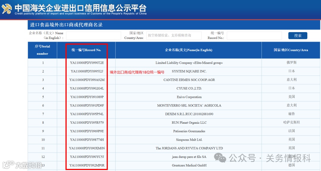 A:如需查询进口食品境外出口商或代理商的18位统一编号,请访问海关总署企业信用网 http://credit.customs.gov.cn/,并点击“进口食品境外出口商或代理商名录”板块。用户可输入以下任意一个条件进行搜索:
