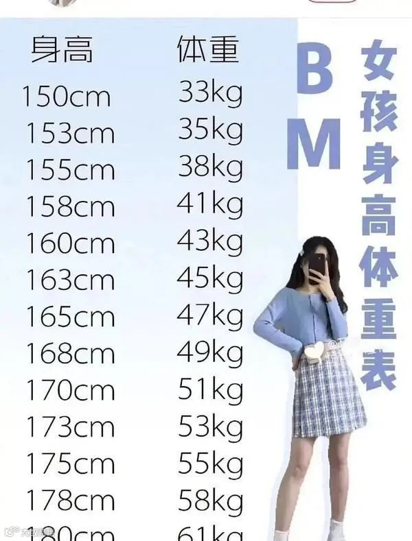 网上流传了一张身高和体重的对比图,如身高165厘米的女生,正常体重为55.6公斤左右,但是能把自己塞进衣服里的“BM女孩“需要47kg。这样严苛的标准也伴随着巨大争议。