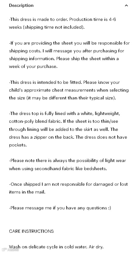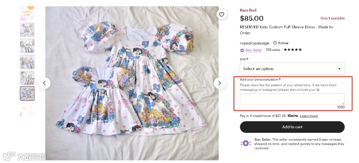 但有一项服务比较特殊—个性化定制泡泡袖连衣裙,用户可以在框内描述想要的床单图案,或者选择承担运费直接邮寄床单。定制的价格为 85 美元,支持分 4 期付款。