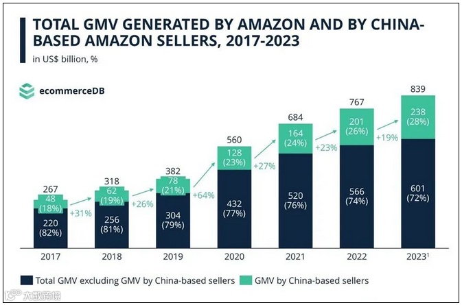 eCommerceDB预测,到2023年底,中国卖家总的GMV将达到2380亿美元,将会占到亚马逊总GMV的28%。