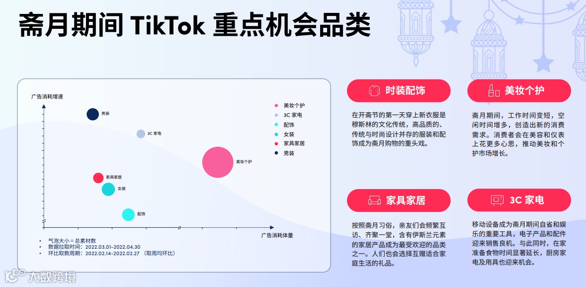 根据 TikTok for Business 发布的 2023 年斋月营销报告显示,时装配饰、美妆个护、家具家居、3C 家电将是斋月期间 TikTok 的重点机会品类。