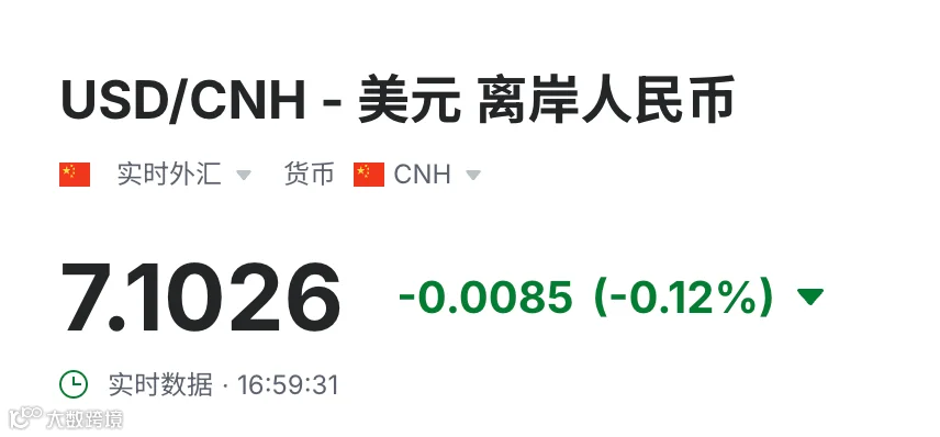 11月4日,离岸人民币兑美元升破7.10关口,人民币汇率迎来大幅上涨,离岸人民币兑美元汇率自10月15日以来首次突破7.10关口,盘中最大涨幅接近500点。