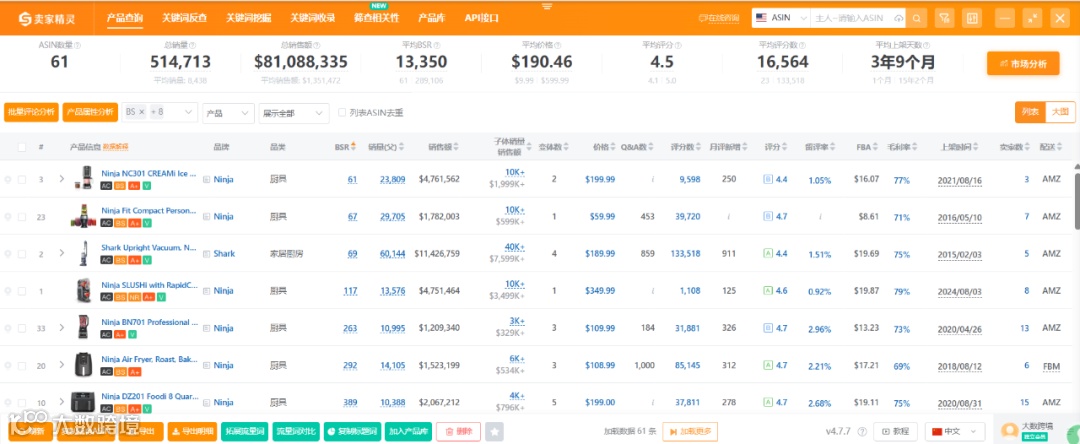 根据卖家精灵提供的数据得出,SharkNinja在亚马逊上产品销量和销售额表现较为突出,总销量达到五万件以上,总销售额高达8千万美元,平均ASIN对应销量为8438,平均销售额为135万美元,显示出较高的市场需求和消费认可度。