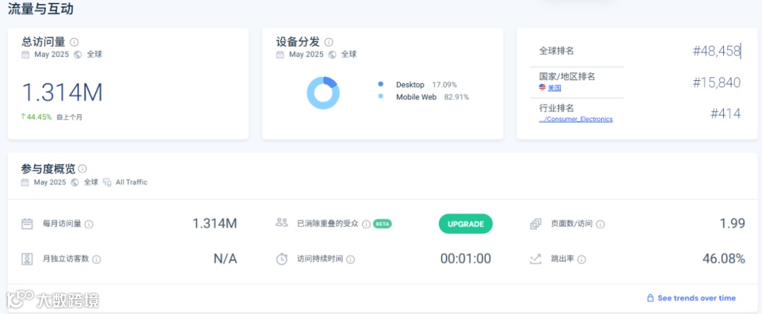全球排名#48458、美国排名#15840以及在消费电子行业排名第414名,说明品牌在全球及特定区域、行业内都具有一定的竞争力和知名度,处于相对靠前的位置。