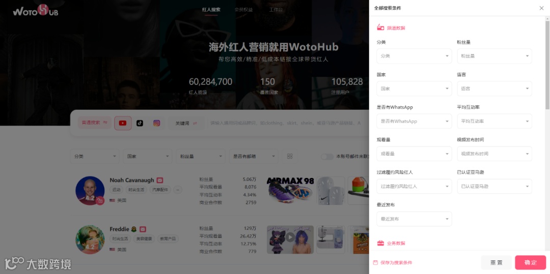 海量优质红人资源: 平台整合全球超6000万活跃网红,覆盖YouTube、TikTok、Instagram等主流平台,横跨150多个国家、200多种语言,选人范围广阔。