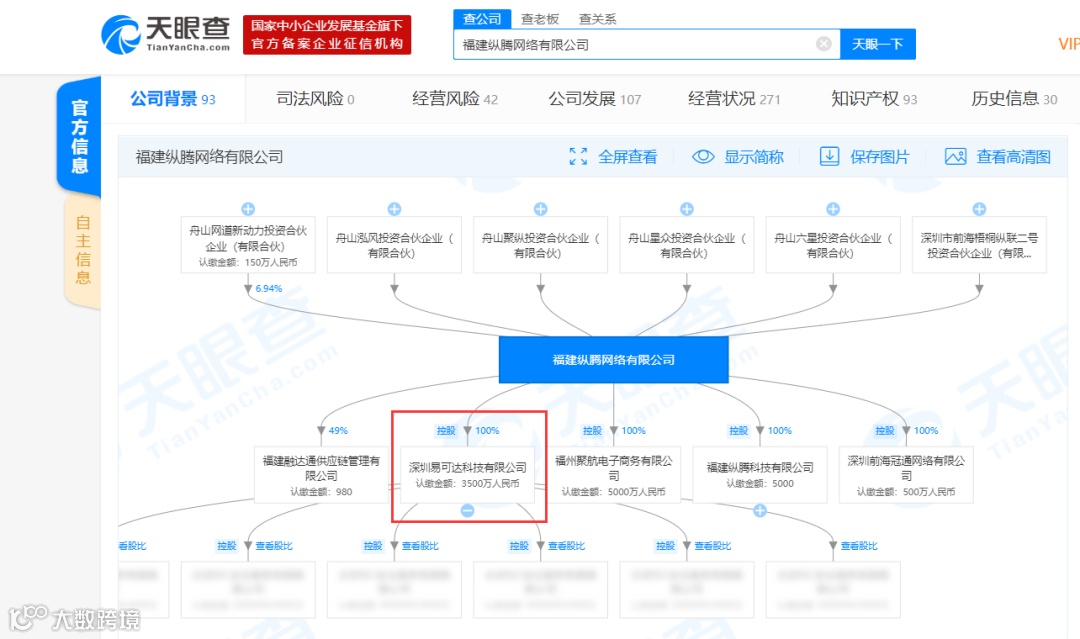 当时不知从哪里有了解福建一家公司叫做纵腾,然后他们下面的某个公司做「一件代发」的业务挺多的,但是具体他们的产品或者是系统是什么我一直都不知道。后来机缘巧合之下我去查了一下天眼查的信息,无意中在控股资料这一块看到了一个有点眼熟的公司——深圳市易可达科技有限公司,这个公司似乎好像也是做海外仓业务的, 然后我就顺着这根线查了一下,发现他们家的产品是谷仓。