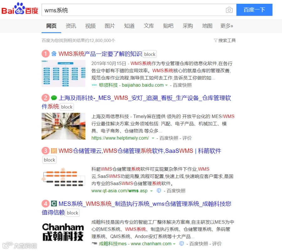 例如同样是搜索WMS系统,对比一下百度和Google的内容,就会发现一些差异。