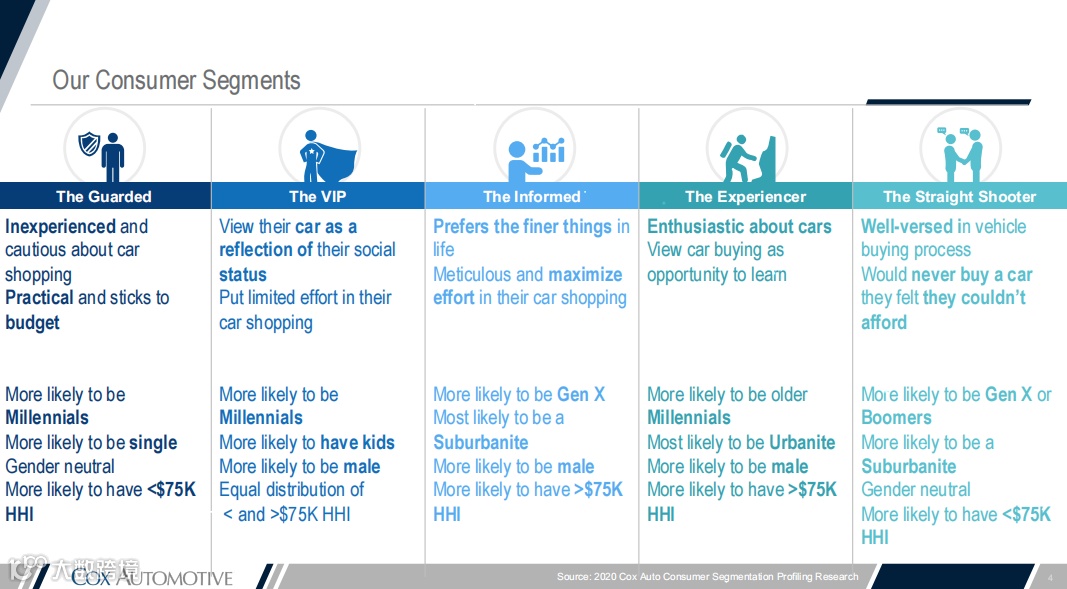 - 谨慎型消费者:谨慎且缺乏购车经验/实际并坚持预算/更可能是千禧一代/更可能是单身/性别中立/家庭年收入不超过75000美元;