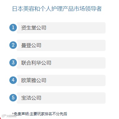 资生堂株式会社(日本一家跨国个人护理公司)、曼登控股有限公司(日本化妆品和保健食品公司)、联合利华(英国-荷兰跨国消费品公司)、欧莱雅(法国跨国个人护理公司)、宝洁公司(美国跨国消费品公司)是目前市面上的主要日本化妆品领导者。