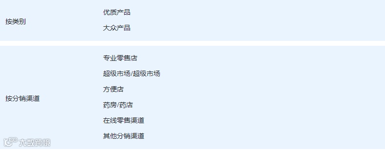 根据类别,市场被分为高端产品和大众产品。分销渠道细分包括专业零售店、超市/大卖场、便利店、药房/药店、在线零售渠道和其他分销渠道。对于每个细分市场,目前市场规模和预测未来规模都是基于价值(百万美元)进行的。