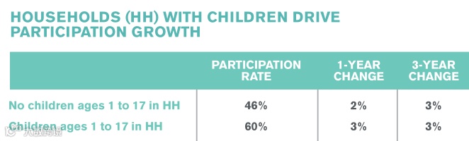 研究发现,有孩家庭户外活动参与率为60%,没有孩子的家庭参与率则为46%。有孩家庭更愿意选择参与户外活动。