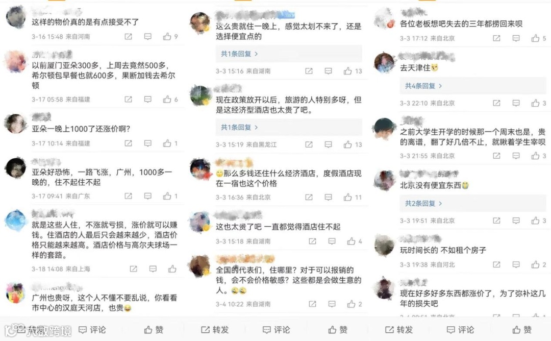 在社交平台上,不少网友吐槽多地酒店价格近期大涨。一名网友说,“以前厦门亚朵300多,上周去竟然500多。”也有网友称“广州不少酒店价格已较过去两年翻了一倍。”