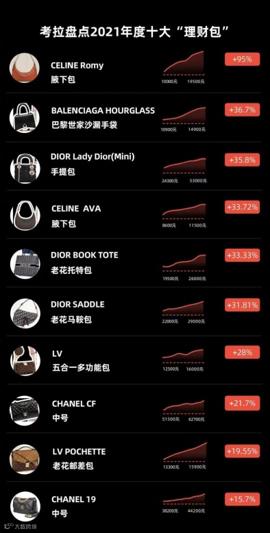 甚至还会有平台根据消费者需求发布理财包调查报告。考拉海购发布的《2021年度十款“理财包”》报告显示,2021年涨价幅度最高的Celine Romy腋下包,较年初发售价涨幅高达95%,大幅跑赢了基金和股市大盘。排名第二的巴黎世家沙漏手袋,也从10900元涨到14900元,涨幅为36.7%。