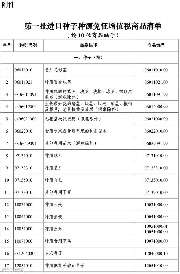 - 由农业农村部发布最新《进口种子种源免征增值税商品清单(第一批)》,请各直属海关遵照执行;