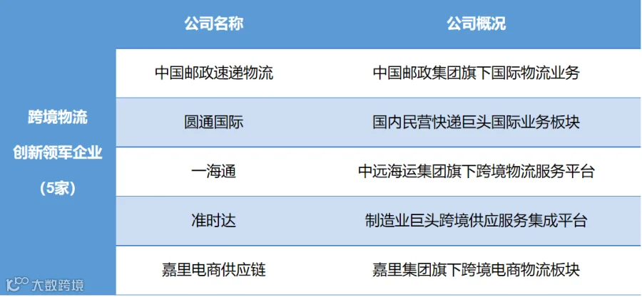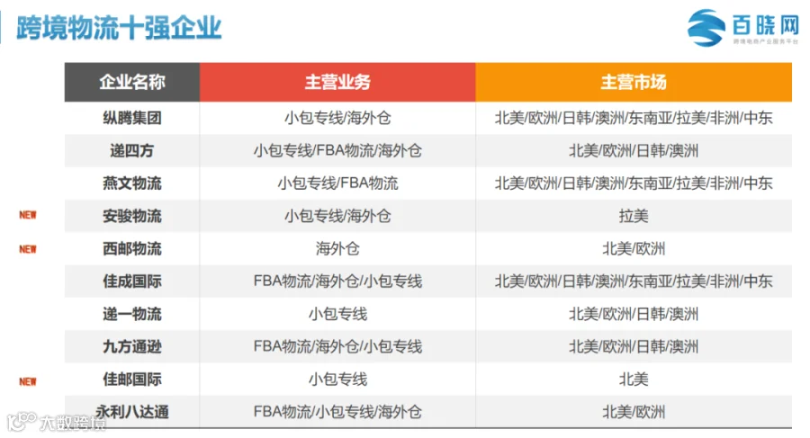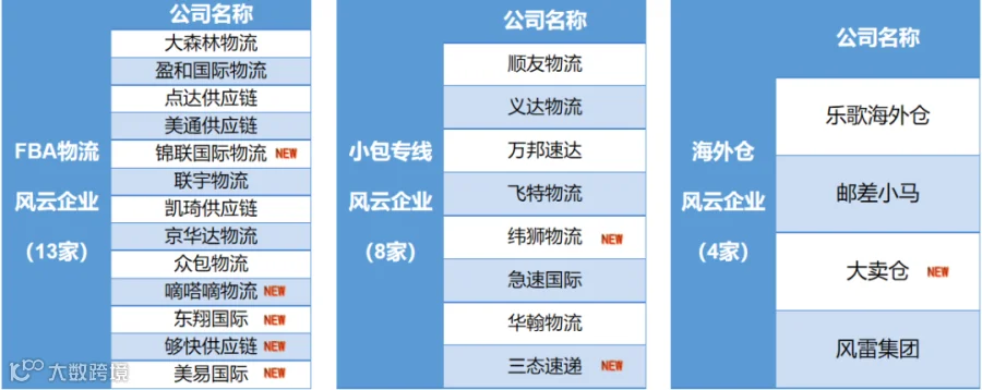 此次入选上榜的有10家十强企业、25家风云企业和5家创新领军企业。其中十强企业和风云企业为以跨境电商物流为主营业务的企业,创新领军企业则是以不同模式/维度切入跨境电商物流赛道的行业上下游以及其他领域巨头企业。