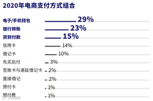 谈及东南亚市场,很多卖家朋友首先想到支付方式想必是货到付款。确实,货到付款在东南亚地区非常流行,但是由于疫情的影响,在线支付也在当地大幅增长。以越南为例,虽然去年最为主流的支付方式仍为货到付款(28%),但是比起2019年,现金使用率已经下降了32%,而手机/电子钱包的使用率则增加了两倍。如MoMo、PayPal都是当地比较受欢迎的电子钱包支付方式。 图源:The Global Payments Report 同样地,印尼消费者在2020年也大大减少了现金的使用,在外出购物时会更倾向于使用电子钱包进行支付。印尼是亚太地区电商增长率最高的国家之一。去年,印尼的在线支付方式主要是电子钱包和银行转账,两者均明显高于货到付款的市场份额。 图源:The Global Payments Report