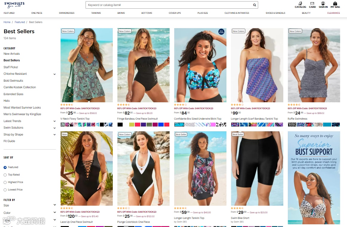 Swimsuits for All的定价从几十美元到上百美元不等,价位比Cupshe高一个档位,不乏一些150美元左右的中高档泳衣。和讲究“暴露”的比基尼不同,我们可以看到Swimsuits for All的很多产品都是偏保守,能够更多包裹着消费者身体的泳衣款式。