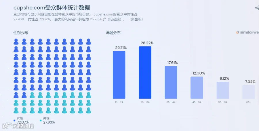 Cupshe一开始定位于年轻、注重品质和时尚的欧美Z世代女性。2019年Cupshe扩大产品线,添加了大码泳装、泳装披肩、男性泳裤、儿童泳衣等产品,也吸引了全职妈妈、大码女性、儿童、男性消费群体等广泛的受众,但其主要消费者还是18-34岁之间的年轻女性。