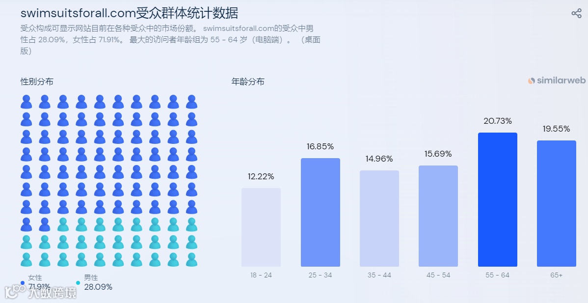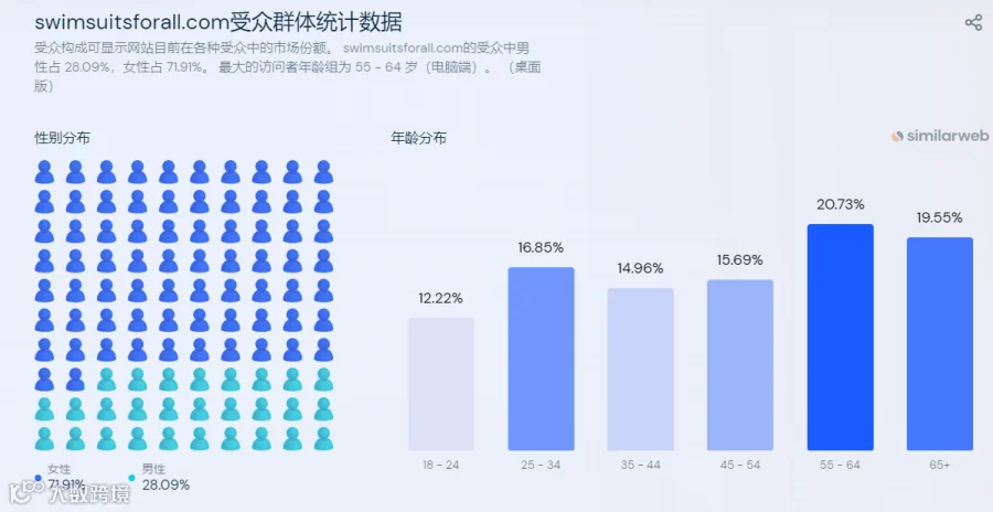 Swimsuits for All专注于大码女装-泳装市场,以在身体多样性方面突破界限而闻名。Swimsuits for All的消费者通常是大码女性,有相当大一部分比重集中在55岁以上的老年人,因此有强烈的提高自信心和自我接受方面的需求。