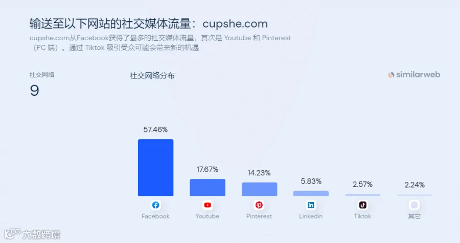 目前Cupshe在Facebook和Instagram上的粉丝数均已超过百万,而根据similarweb的数据,Facebook、YouTube和pinterest是对Cupshe官网流量贡献最大的三个网站。