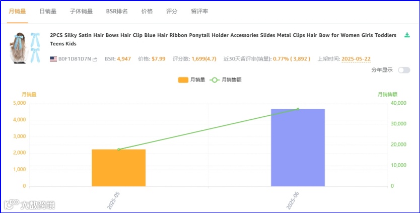 据卖家精灵数据,该商品上架仅20天便已推出23个变体,近30天内父体销量达3892单,预计六月份销量有望接近5000单。当前平台售价为8美金,扣除佣金(1.2美金)、FBA费用(2.91美金)以及国内采购和物流成本(约1.5美金)后,账面利润率约为35%。尽管销售表现亮眼,但整体利润水平偏低,仅属一般水平。