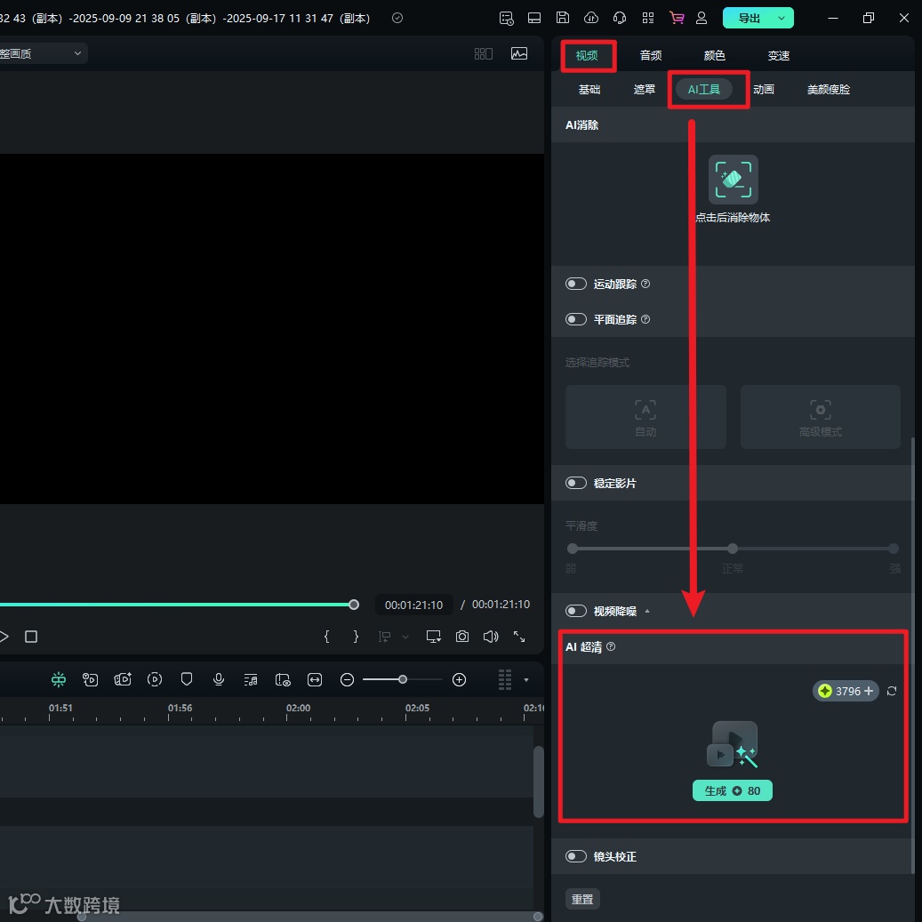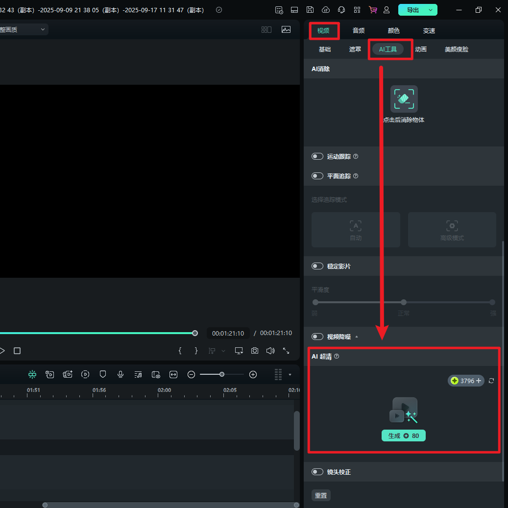 如果你暂时没换机,又希望视频显得更清晰一些,可以试试万兴喵影的【AI超清】功能。