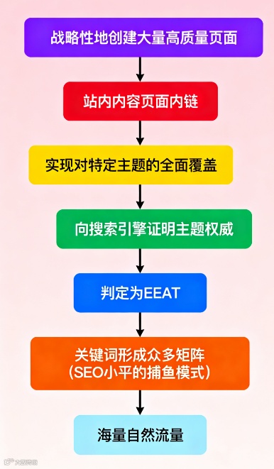 战略性创建大量高质量、互联内容 → 实现主题全覆盖 → 展现主题权威与E-E-A-T → 形成关键词矩阵流量池 → 获取规模化自然流量