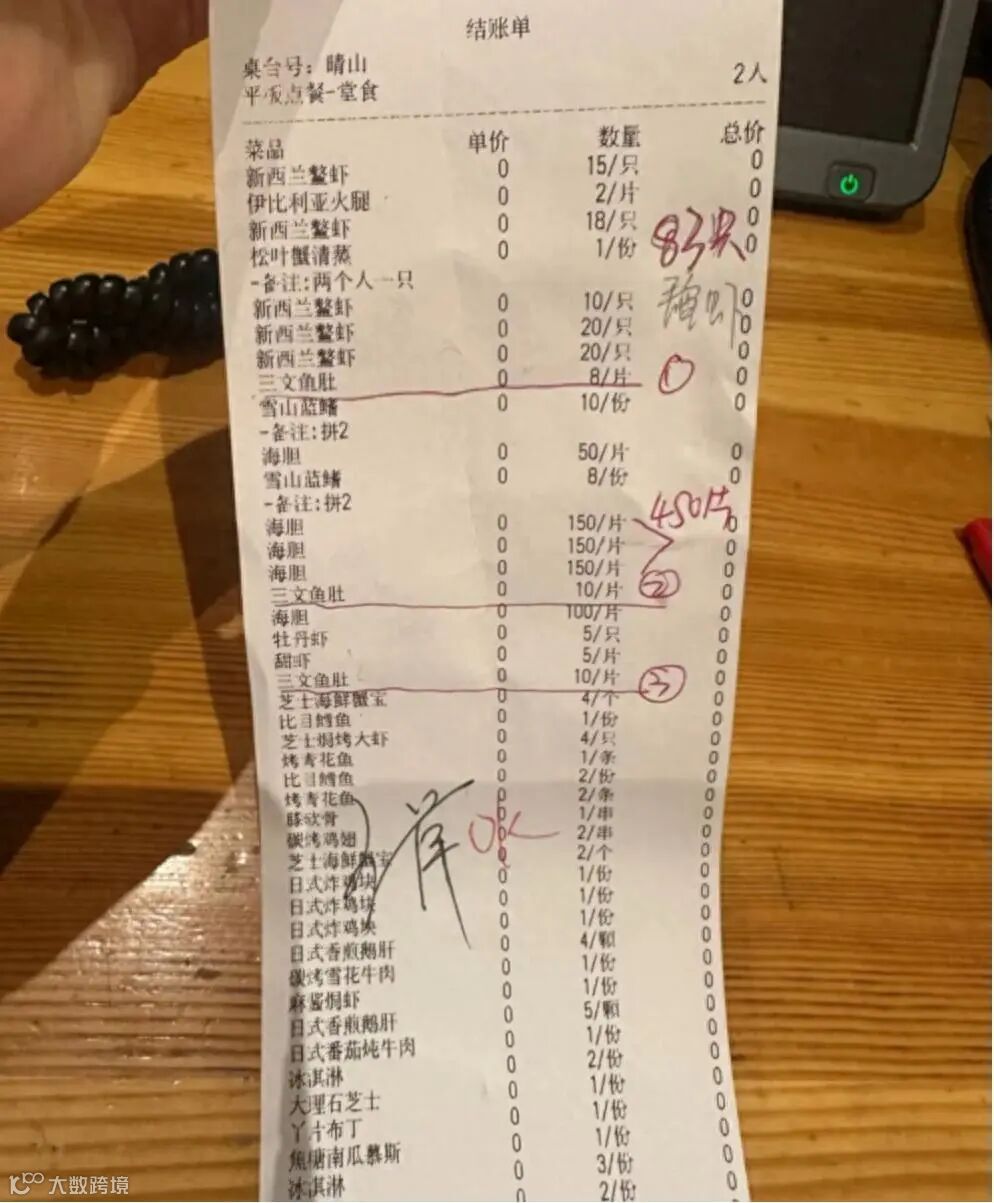 工作人员称,收桌时发现桌面上大量虾蟹壳下覆盖着完整未食用的三文鱼,“属于明显浪费且有藏匿行为”。根据菜单标价,未食用的十几片三文鱼价值约百元,店方最初仅要求赔付该金额。
