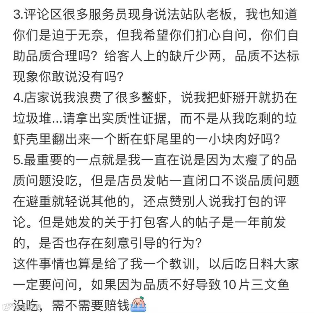 因顾客对赔偿提出异议并要求与店长沟通,而店长当时已下班,待其返回店内后,顾客再次提出三文鱼“太瘦不想吃”。店方随即决定不收取任何费用,并劝导其今后避免浪费。