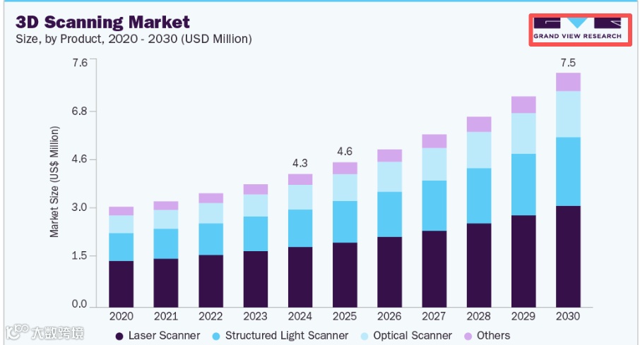 3D扫描市场正处于快速增长阶段,多家研究机构预测该行业将以7-13%的年复合增长率持续发展至2030年。手持3D扫描器作为细分市场,因其在逆向工程、质量检测、文物保护和影视制作等领域的应用优势,显示出比整体市场更高的增长潜力。