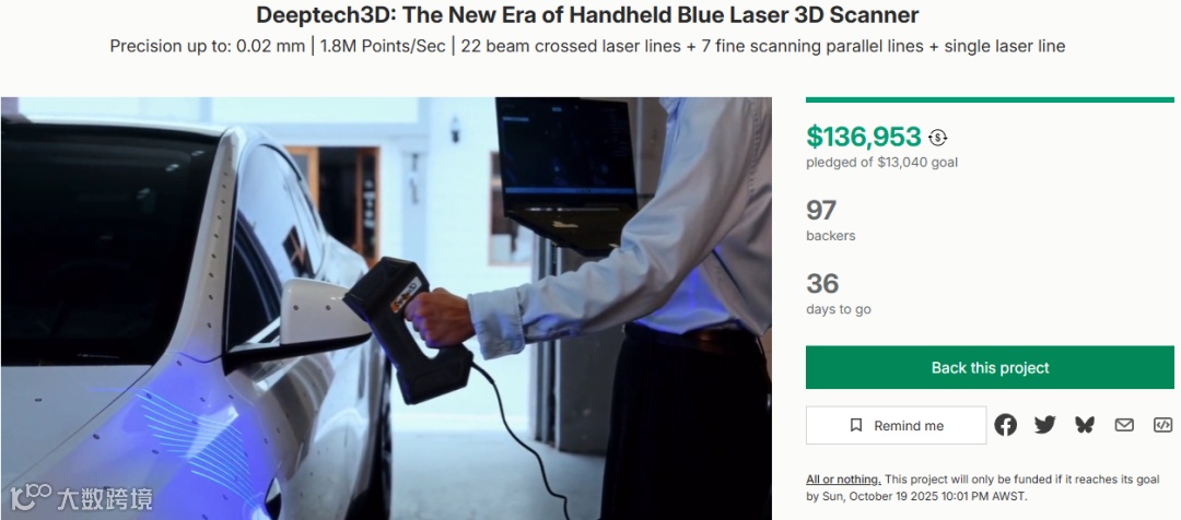 Deeptech3D的StarX项目正在Kickstarter平台进行众筹,项目周期从2025年9月4日至10月19日。根据第三方跟踪平台数据显示,目前已获得约97名支持者,筹资总额达到约12万欧元。该项目以高性能低价位的激光扫描仪为主要卖点,目前渠道的效果还是不错的,不过项目最后的募资金额应该不会很大!交付可能也会有些问题,具体可能还是得看后期的项目进展