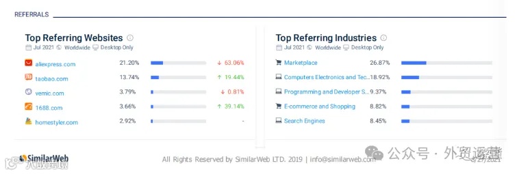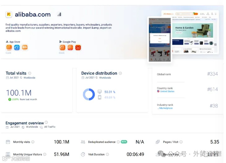 可分析alibaba.com的站外流量来源构成,页面访问数据,关键词来源等,对运营阿里国际站和理解推广策略有很大帮助。