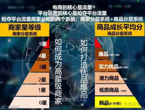 要做好阿里巴巴流量运营,最重要的就是先搞清楚阿里流量分配的规则。阿里流量匹配的核心逻辑总体上就是让配对标签的买家和商家相互匹配,兼顾公平和效率,俗话来讲就是门当户对。不管是搜索排名匹配的逻辑也好,还是智能推荐。总体上星级越高的商家,能获取更加优质的流量,这就是为什么阿里一直在透传的一定要努力成为4、5星的商家。如果有运营新店铺和老店铺的同学,就能体会到不同星级平台获取流量的差异。