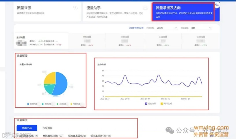 包含站外、店内、客户通EDM、客户通IM、粉丝通、直接访问、其它。用户通过自运营的方式为店铺引流的渠道方式,其实主要还是用于后期私域流量运营。特别适合快消品行业自养客户群,不定期营销。