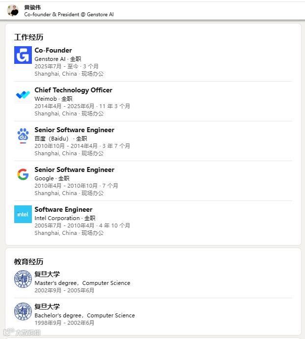 团队信息:据领英公开信息,黄骏伟现任Genstore AI的联合创始人兼总裁,此前曾任微盟首席技术官,任职时间超过11年;早期曾在百度和谷歌担任高级软件工程师,并在英特尔担任软件工程师近5年。教育方面,黄骏伟拥有复旦大学计算机科学学士及硕士学位。