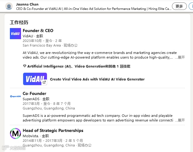 团队信息:据领英公开信息,Joanna Chan现任VidAU.AI的联合创始人兼CEO。Joanna曾任Mobvista战略合作负责人。