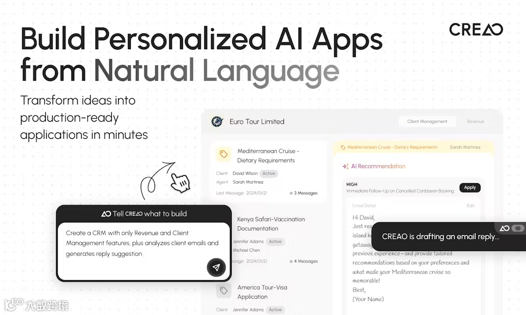 简介:CREAO是一款面向团队用户的定制AI应用构建平台,核心定位为“用自然语言创建个性化AI应用和内置智能助手”,解决传统SaaS“一刀切”难以满足多样化业务需求的问题。