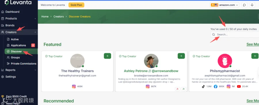 在亚马逊联盟平台Levanta的商家账户的Creators-Discover这可以用关键词去搜索对应的目标联盟客,可以从联盟客的国家,粉丝群体和侧重品类,推广方式和渠道类型等方面进行筛选,还有Top creator标记是个很好的判断联盟客实力的标准。
