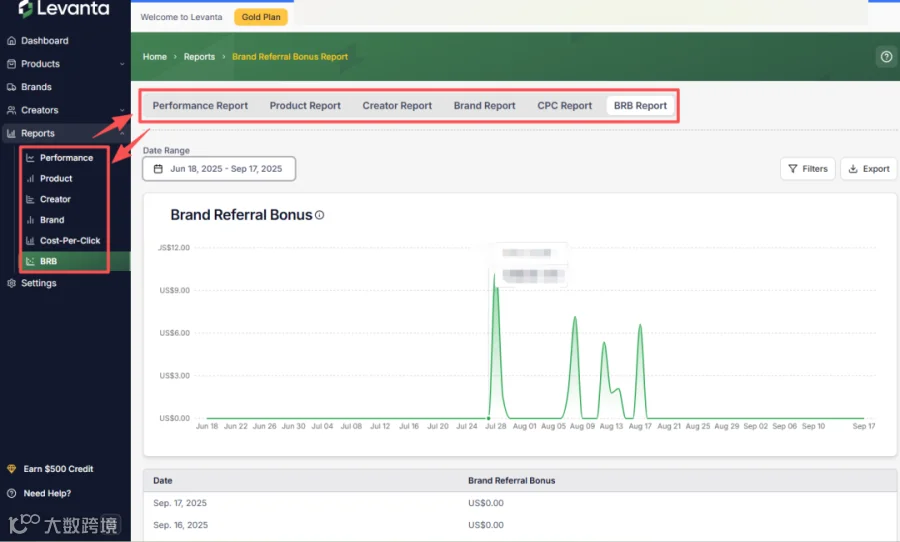 Date range这里可以切换时间段,也可以自定义时间。图表右上角可以切换数据参考维度基准,页面底部还可以查看对应时间段的Top Products和Top Creators.