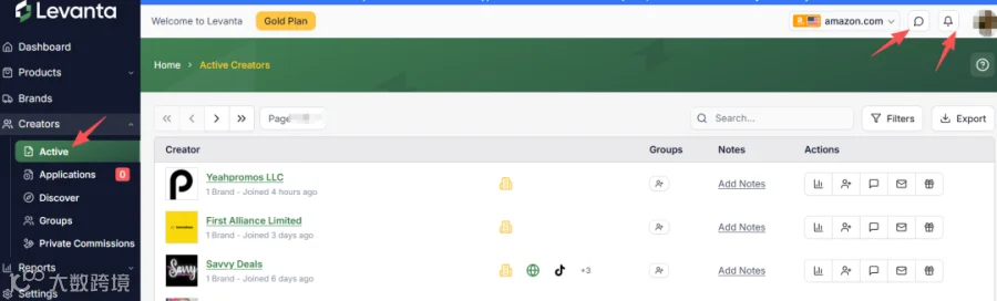1、Creator-Active这个界面的右上角有个铃铛,点进去就是联盟客加入成功的提醒Notifications