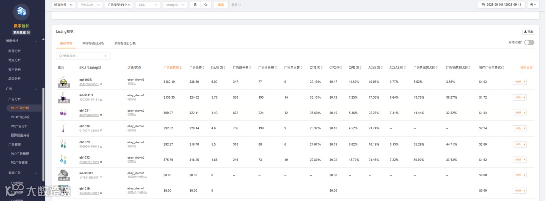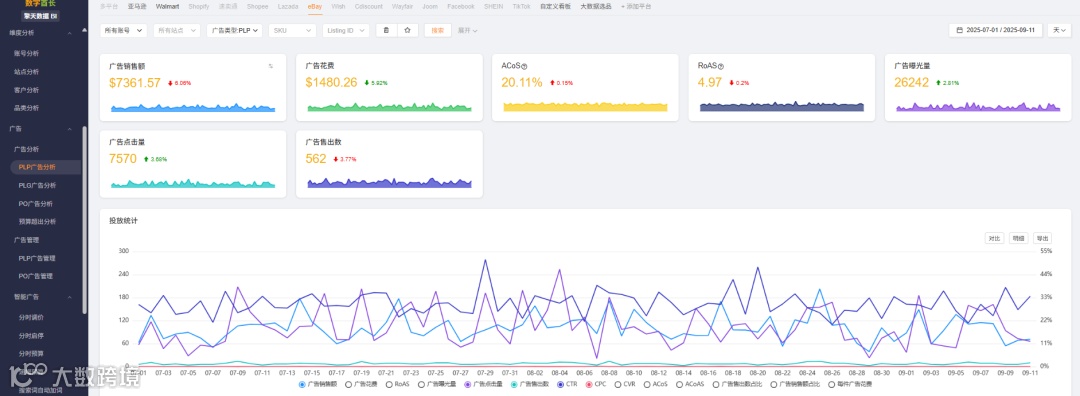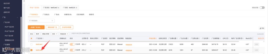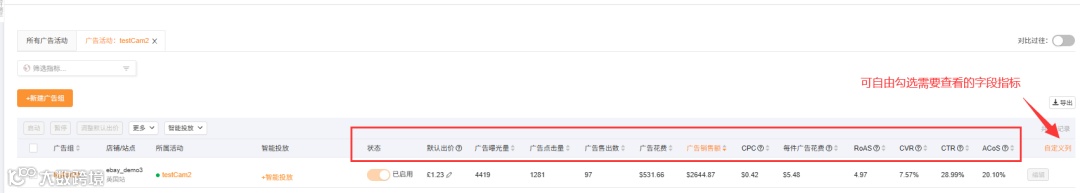 在数字酋长eBay PLP广告管理中,可查看当前广告活动、广告组的详细数据,包括广告销售额、广告曝光量、广告点击量、点击率(CTR)、广告售出数、广告转化率(CVR)、广告投资回报率(ROAS)、广告支出回报率(ACos)等核心指标,全面掌握广告投放数据详情及效果。