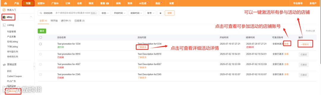 现在,所有卖家都可以直接在【促销活动】页面中,快速查看所有符合eBay要求的官方优惠促销活动及详情,并支持一键同时激活多个eBay账号及站点的促销活动,无需再逐个登录eBay卖家中心手动激活!