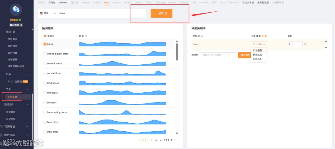 除了上面手动和自动添加关键词外,数字酋长还内置一键【拓词工具】,依托各大电商平台数据,可根据输入关键词智能拓展相关词条,并展示该拓展词的搜索量趋势。通过直观的数据走势,助您精准筛选高潜力关键词,快速添加到广告活动中,从而提升广告效果,获取更多流量与成交转化。