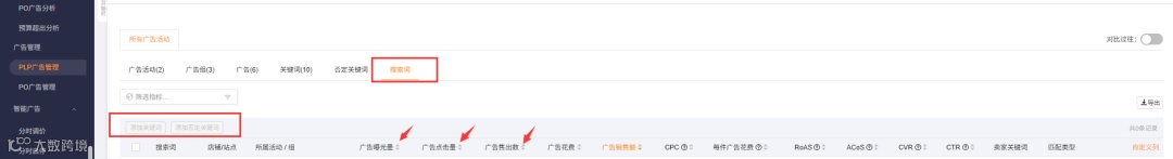 可通过点击上下箭头对字段进行排序,快速定位目标搜索词,一键添加至关键词或否定关键词列表。