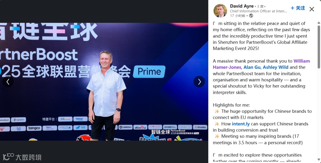 Intent.ly首席运营官David Ayre特别提到,在PartnerBoost峰会期间与多个中国品牌建立了深度联系,并在3.5小时内高效沟通了17家优质跨境品牌,创下个人新纪录。这不仅体现了PartnerBoost强大的资源整合与精准对接能力,也为中国品牌高效开拓欧洲市场提供了重要通路。