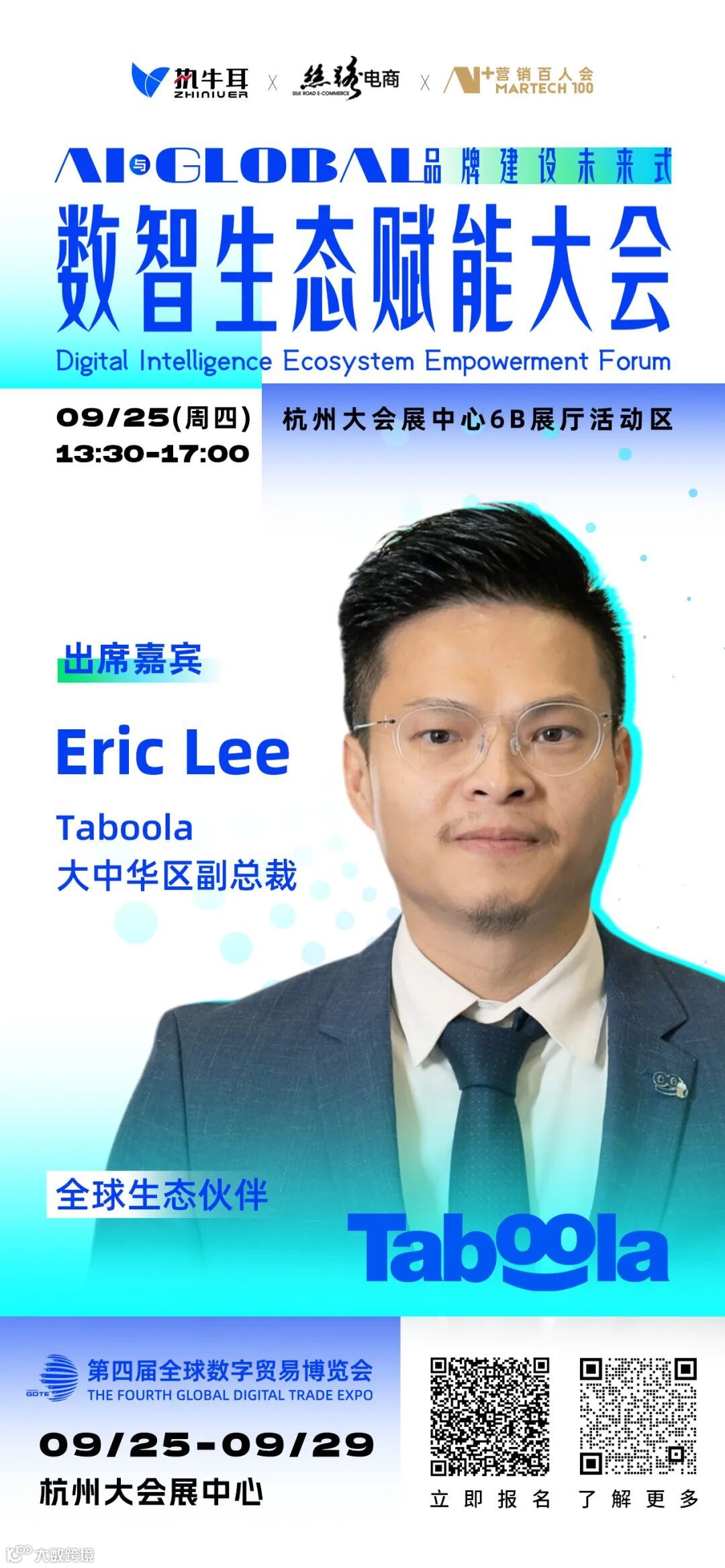 Taboola 大中华区副总裁 Eric Lee 受邀出席本届数贸会,并将于开幕日当天参与以“AI与全球化,品牌建设未来式”为主题的“2025 数智生态赋能大会”。在这一汇聚数字化创新与全球化思维的平台上,Eric Lee 将与来自元气森林、途牛旅游网等知名企业的高层展开深度对话,共同探讨 AI 如何驱动全球品牌建设与商业创新。