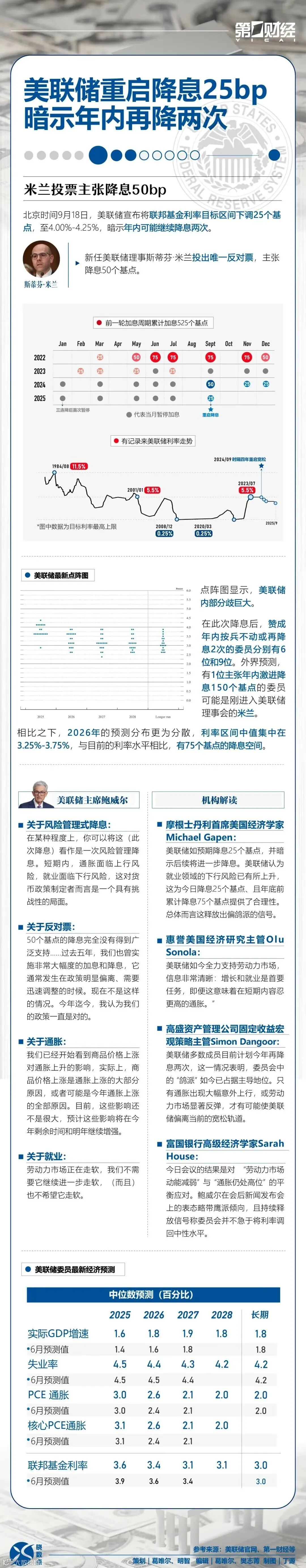 9月18日,美联储宣布2025年首次降息,美国联邦公开市场委员会(FOMC)决定下调联邦基金利率目标区间25个基点,至4%至4.25%,符合市场预期。这是美联储自2024年12月以来时隔9个月再度启动降息周期。